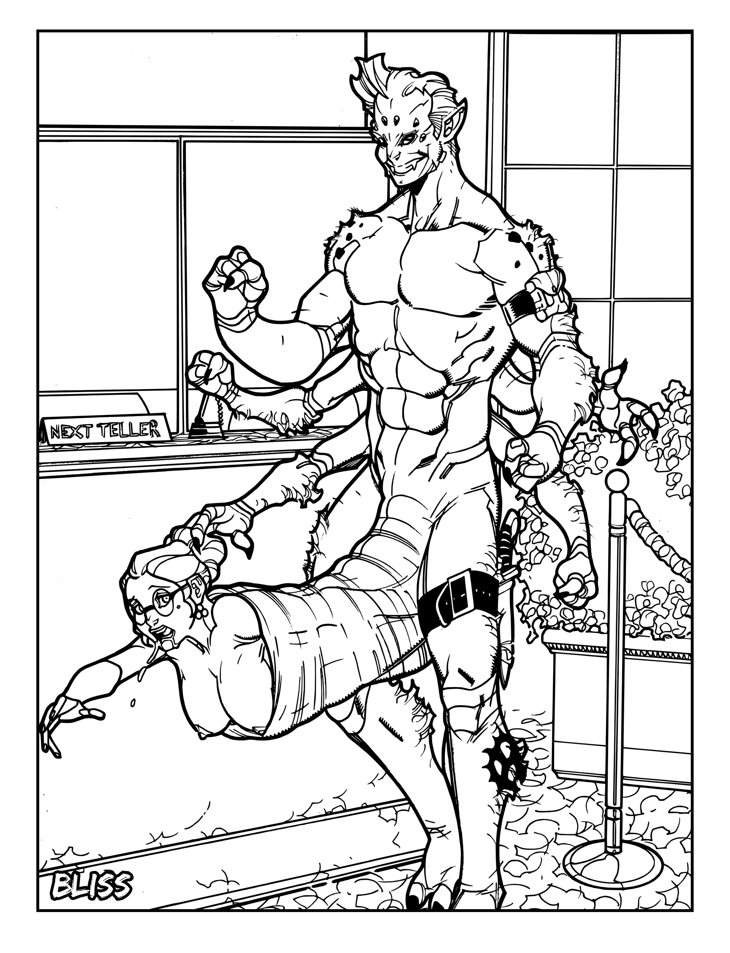 Delenda heads for the line forming underneath PNC's tapestry and waits patiently. Most of the other customers are human too, spiders not having much use for banking services. Some AAA officers in their green sashes patrol the area, though all of the private guards are humans. In the center of the bank, amid modernist benches and squared-off topiaries, one female spider sits and licks an ice cream cone while her male friend kneels between her legs and licks her. All of the humans, including Delenda, pretend not to notice, but the spider girl for some reason notices her. "You look uptight. Wanna borrow him for a minute?" she asks, indicating her friend, who looks up from between her legs with eight puppy-dog eyes. "He's real good at this!" Delenda blushes and avoids eye contact.